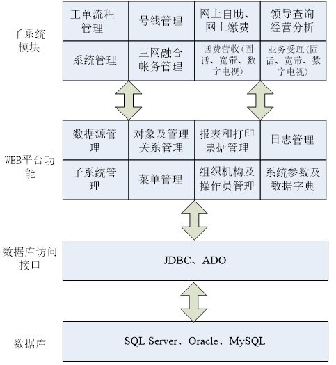 综合业务管理系统实现按分层结构的特点,分为接入层、业务逻辑层、数据逻辑层,系统开发亦继承采用模块化的设计方式,通过业务组件构建系统的业务逻辑,使系统的灵活性、可扩充性得到那很好的保障。专网业务综合管理系统采用集中式的数据结构,进行数据的集中存储和操作,能很好的保持数据的统一性,同时也能保证数据安全。